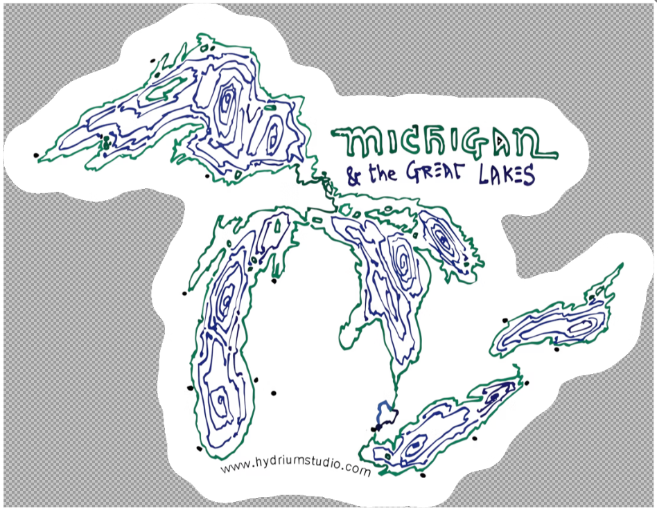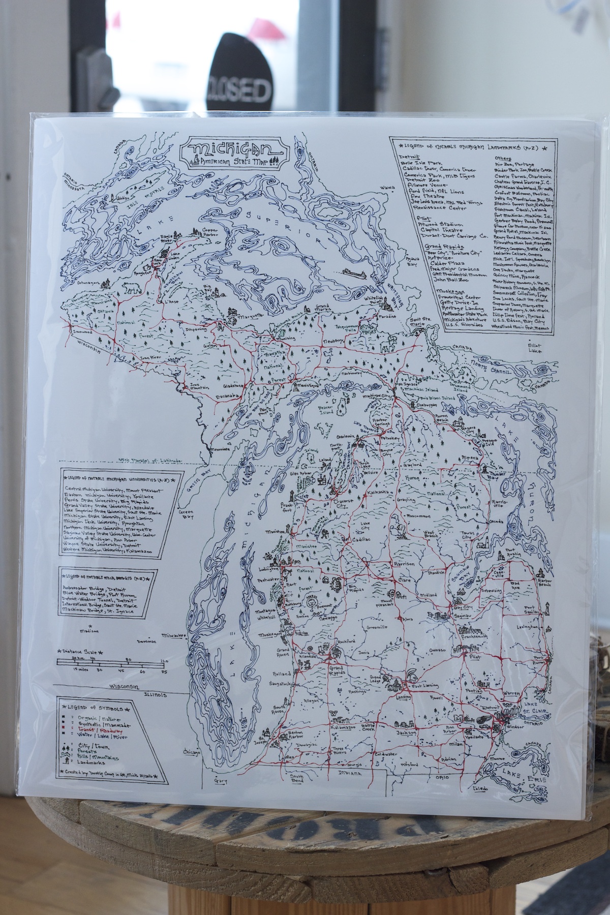 Freehand-drawn Michigan U.S. state map. On matte paper with backboard. Each map comes in resealable sleeve. Ready to frame.